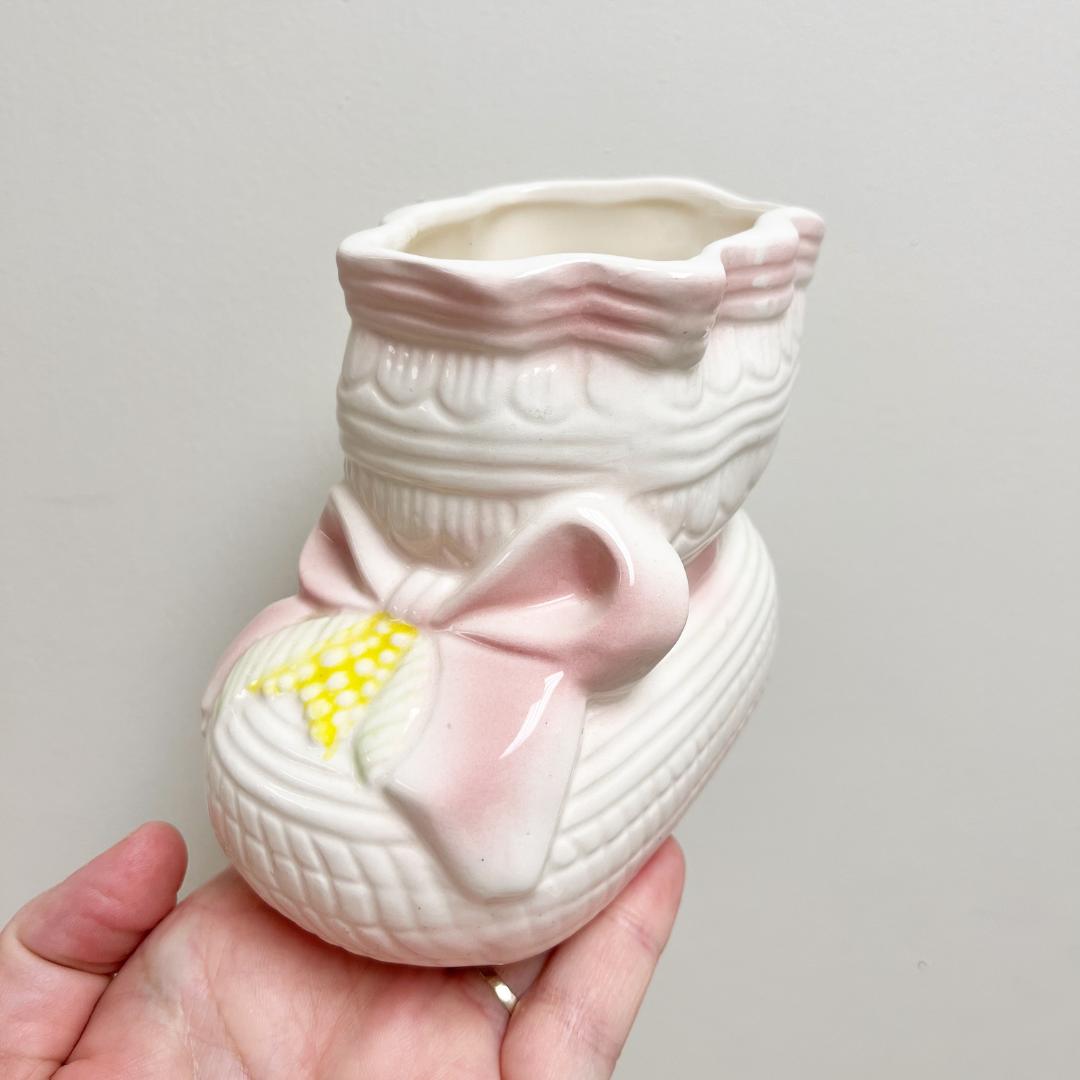 Add timeless charm to your little one’s room with this authentic vintage ceramic baby bootie. Perfect as a dainty succulent planter or a sweet keepsake trinket dish, it’s the ultimate heirloom-style nursery accent for a baby girl.